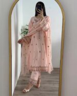 Step into elegance with the Purkashish peach embroidered suit, a perfect blend of timeless grace and modern sophistication. Designed exclusively for the modern Pakistani woman, this suit is crafted to enhance your style with its intricate details and premium quality.